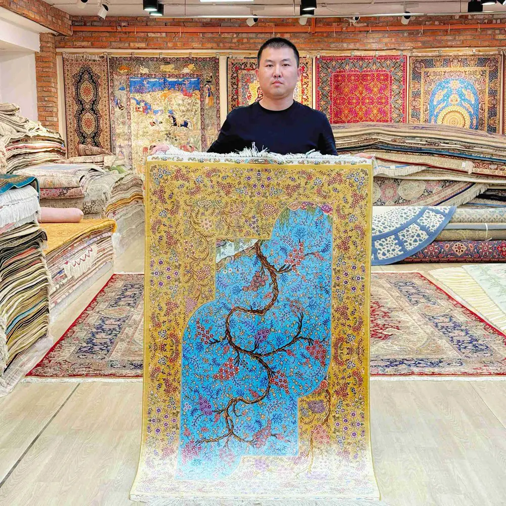 The center of the carpet is blue and the surrounding area is golden. The pattern is plants and flowers.