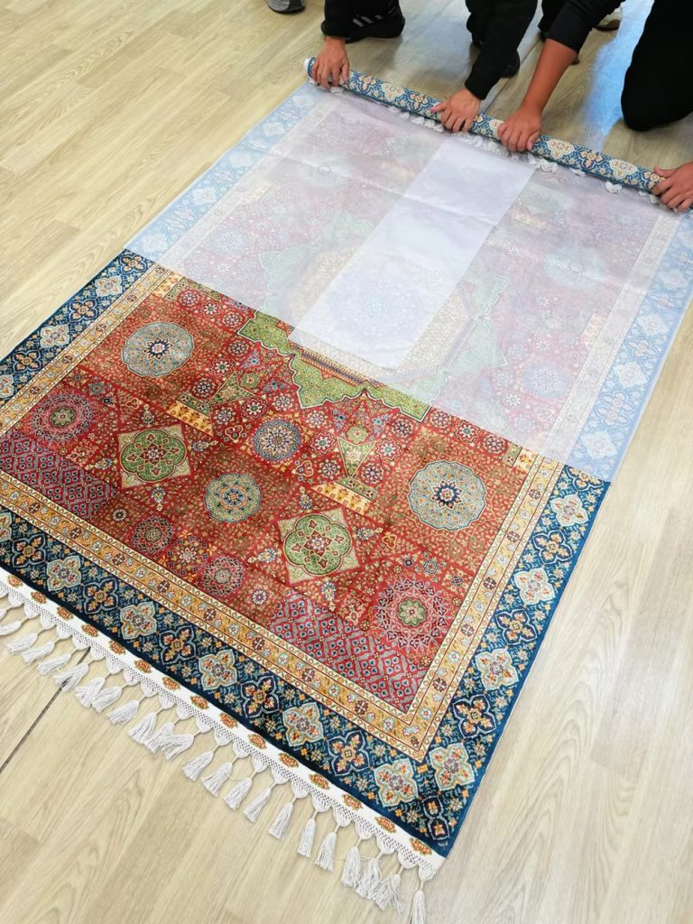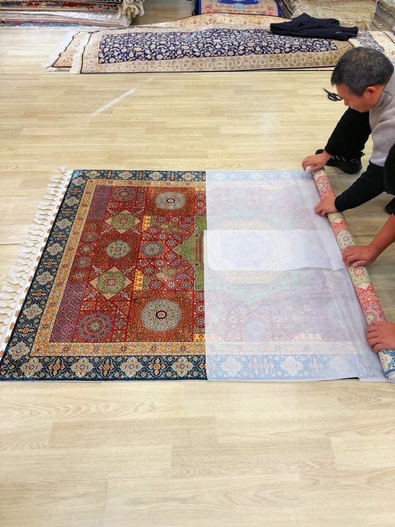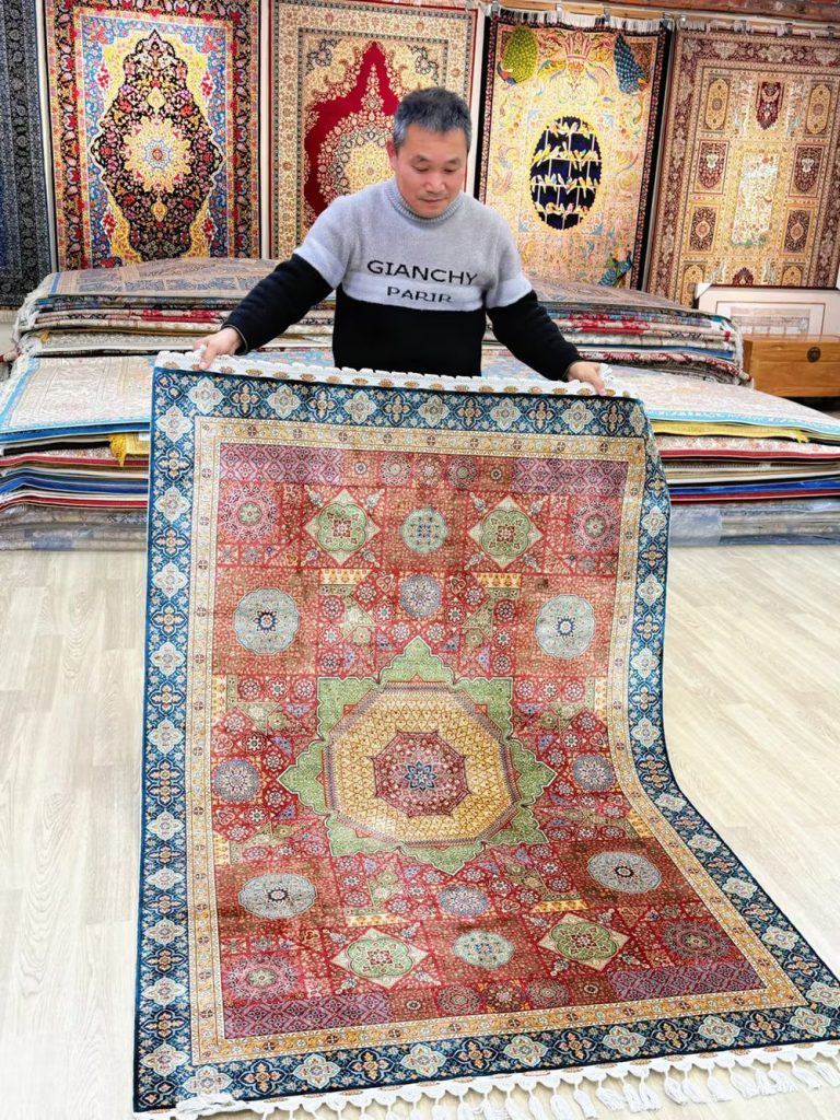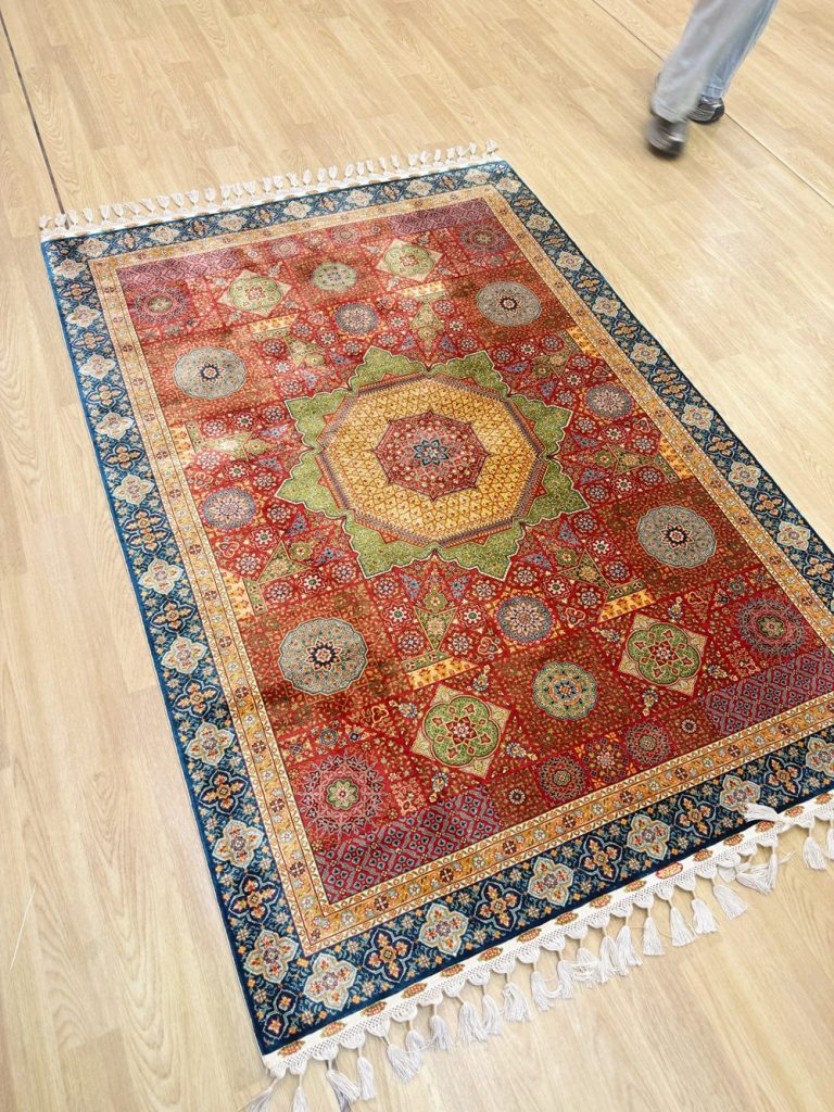 The size of this Mamuluk design handmade silk rug is 4.3x6.2ft.