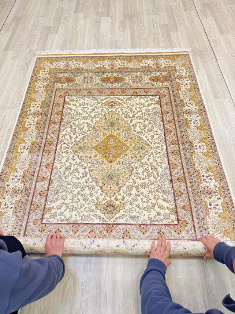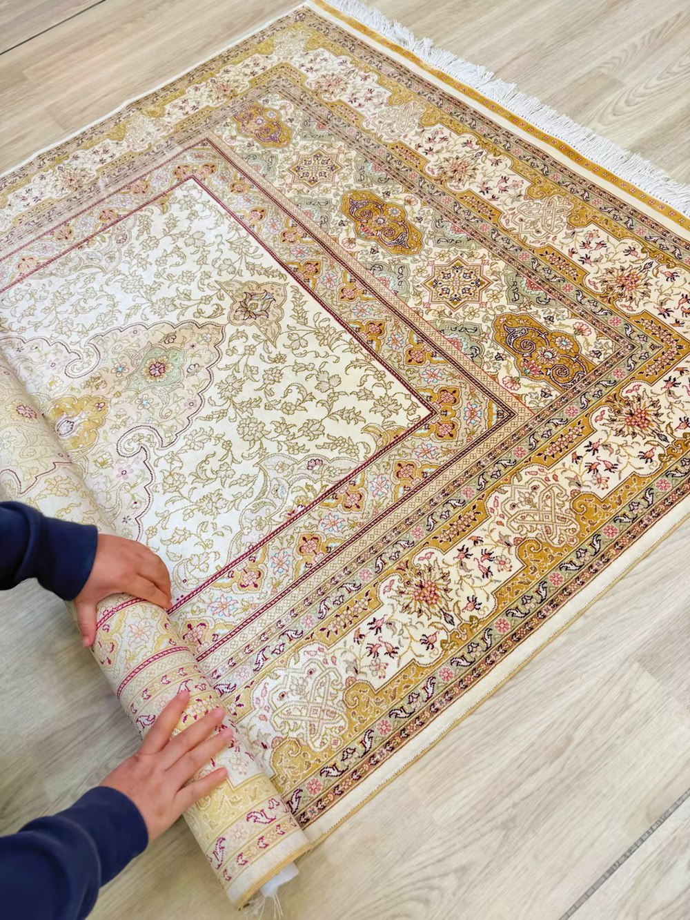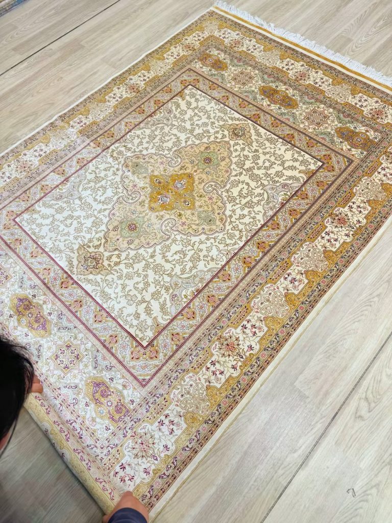This beige 4.5x6.5ft handmade silk rug was packed up.