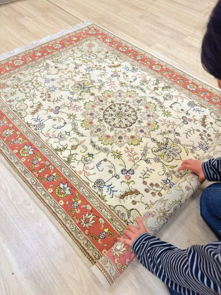 The size of this handmade wool silk carpet is 4x6ft.