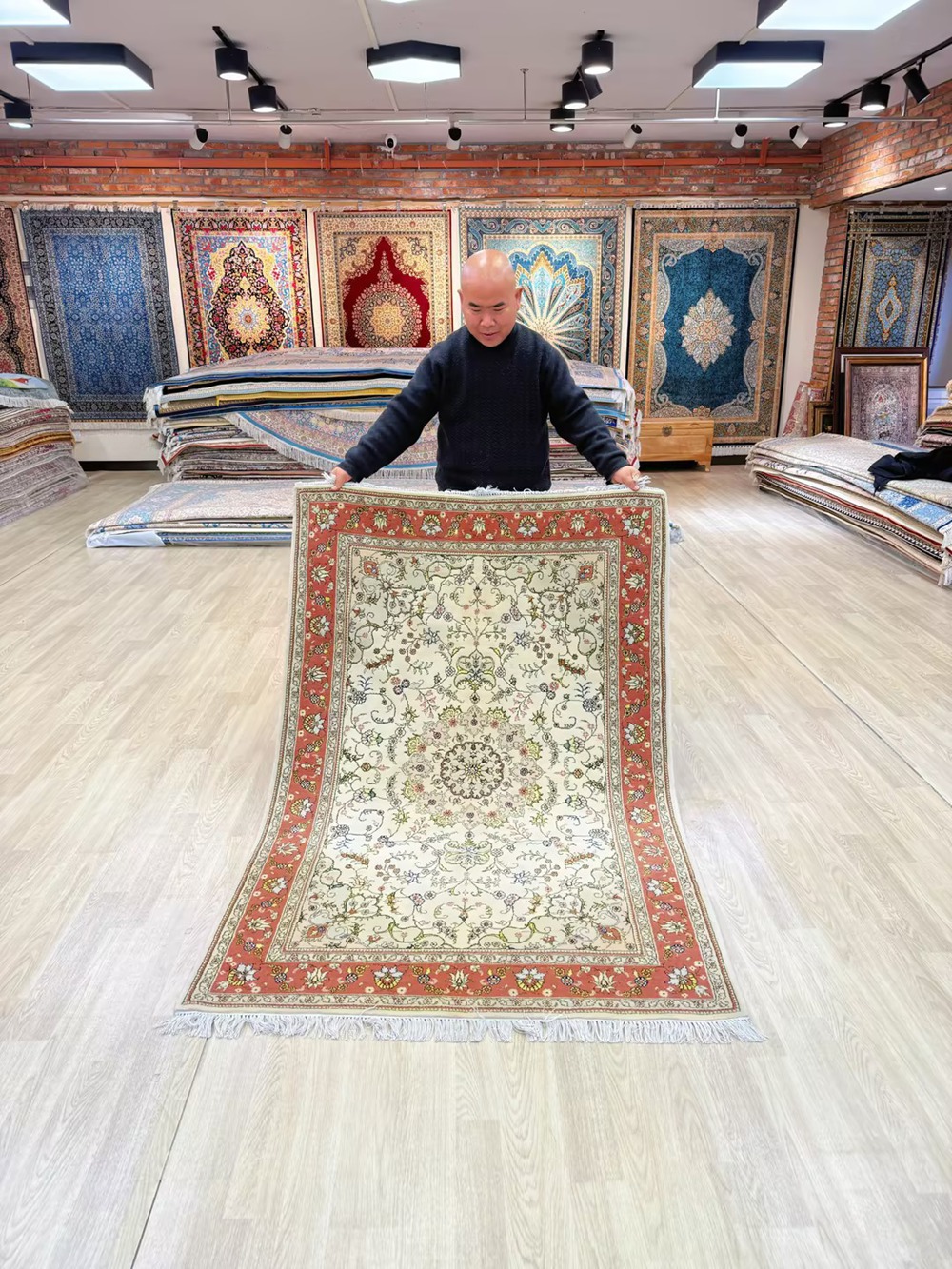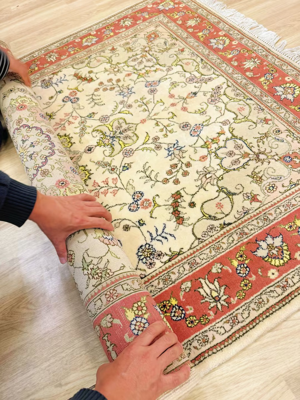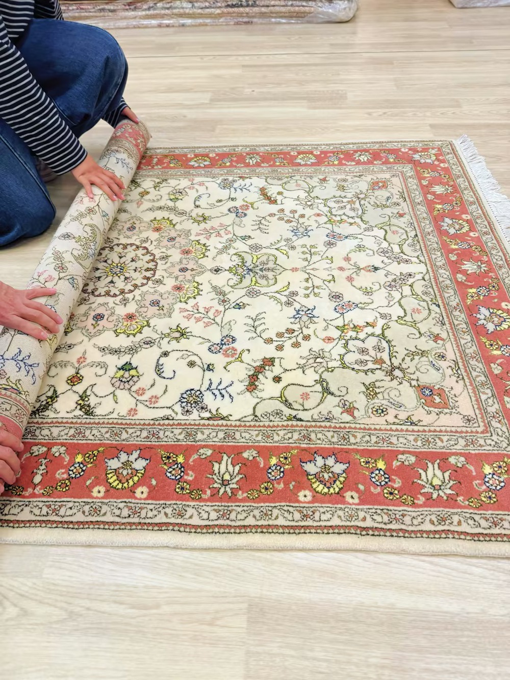 The size of this handmade wool silk carpet is 4x6ft.