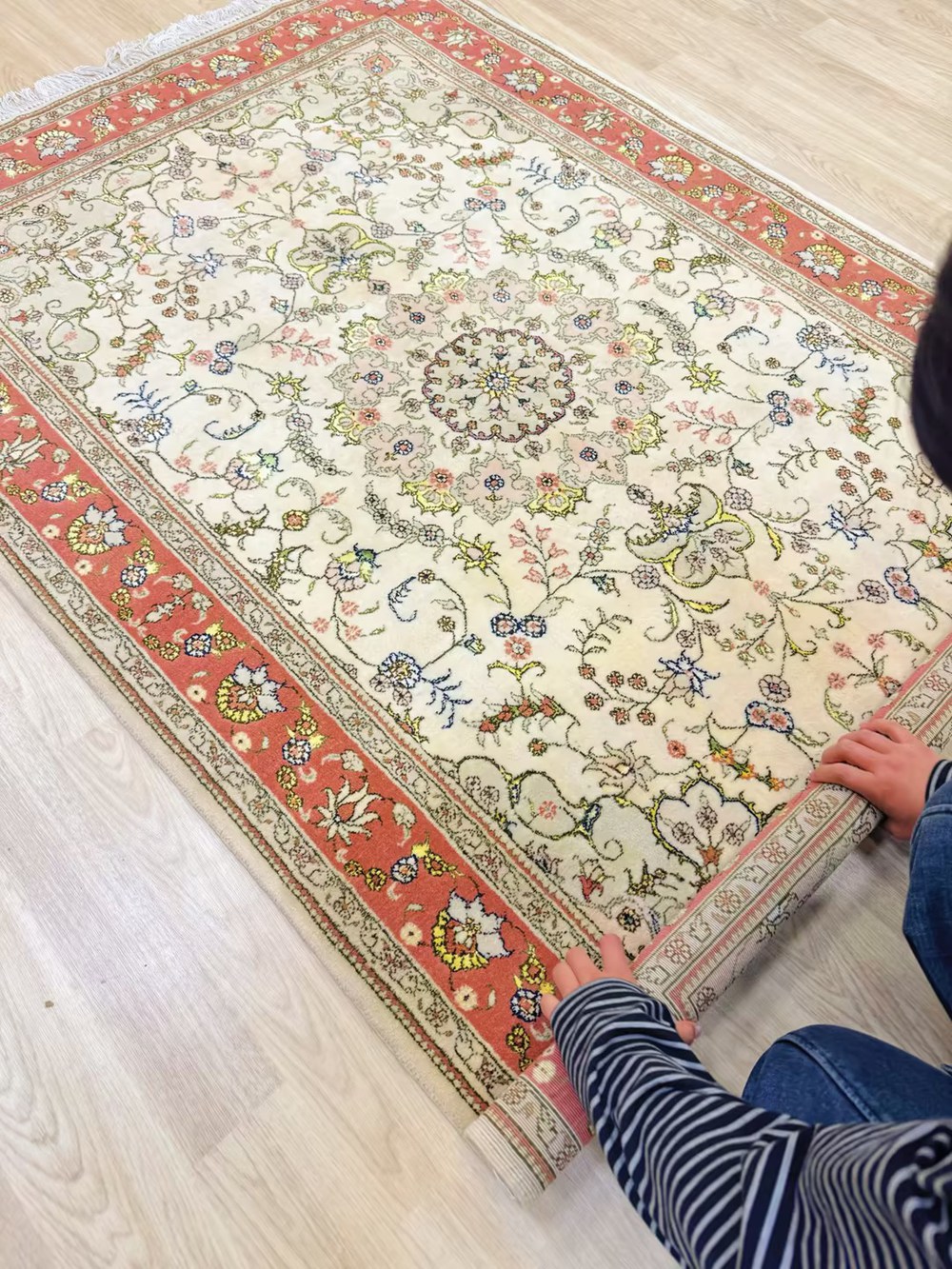 The pattern of this handmade wool silk carpet is very nice.