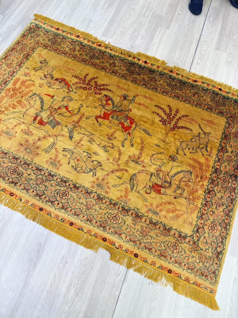 We packed this 4x6ft golden hunting design handmade silk rug tapestry up.