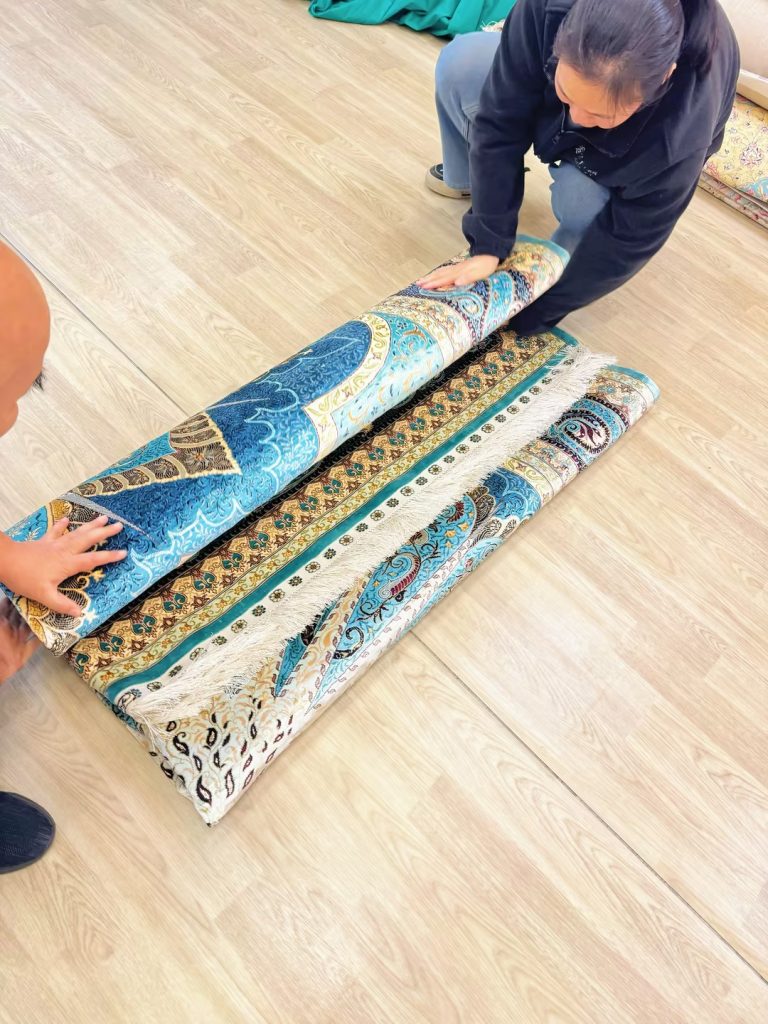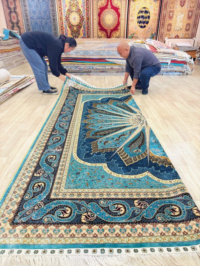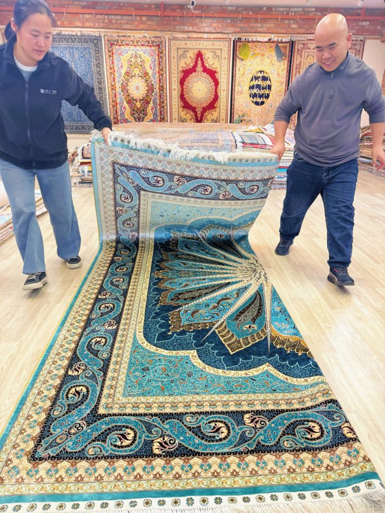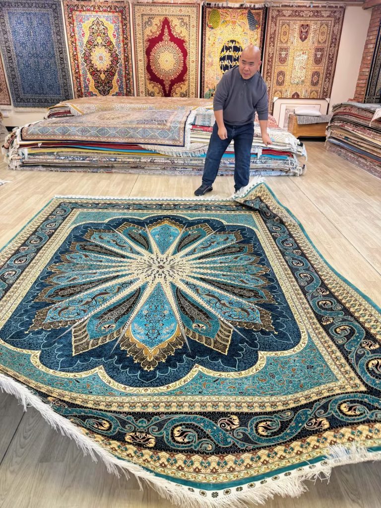 Today we packed up a 8x10ft blue peacock design handmade silk rug for our customer.