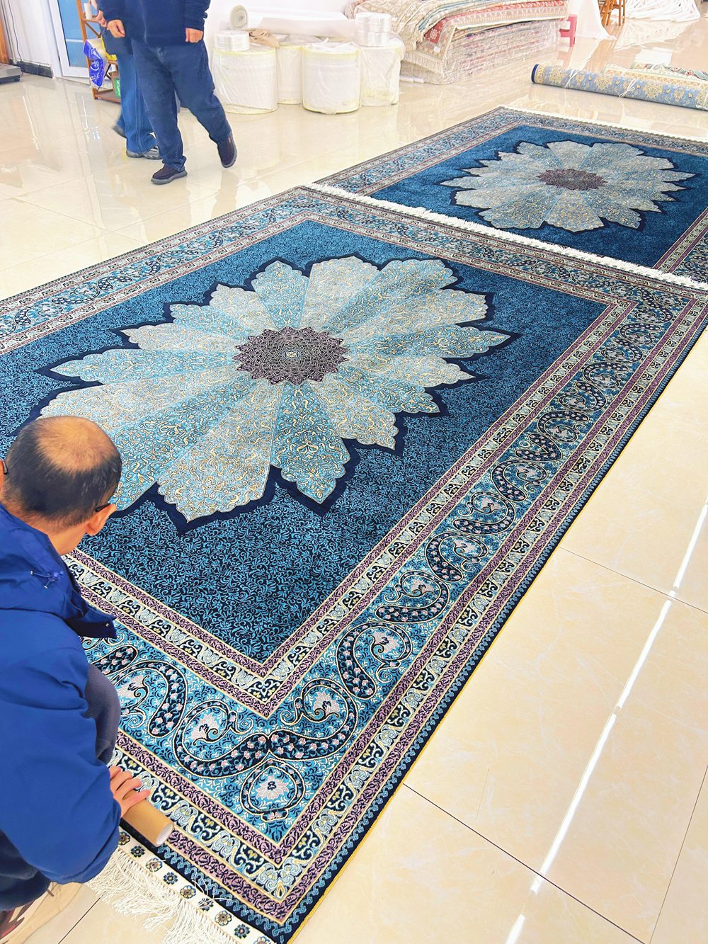 Large size 9x12ft blue handmade silk carpet