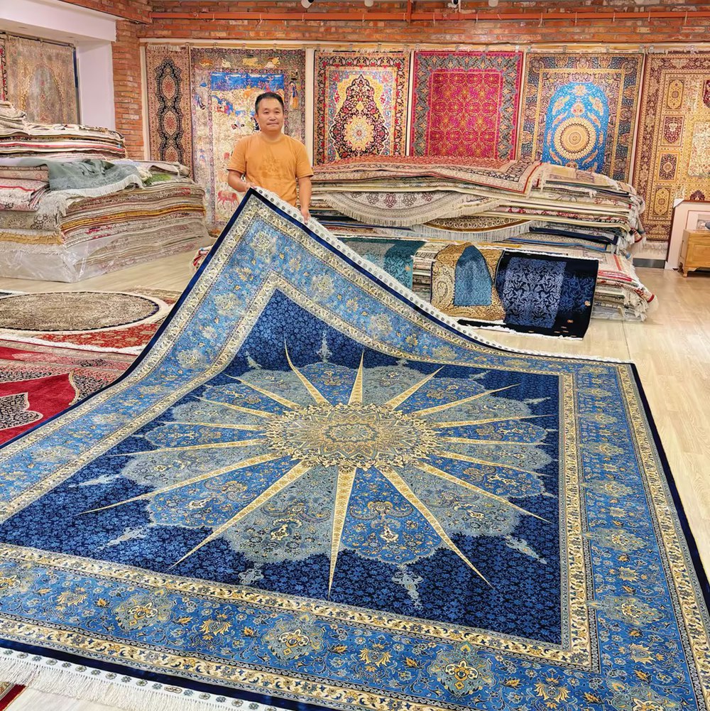 The radiant blue sunburst design is a timeless favorite, featuring intricate rays emanating from a central medallion. This pattern symbolizes energy and harmony, making it a perfect centerpiece for any living space.