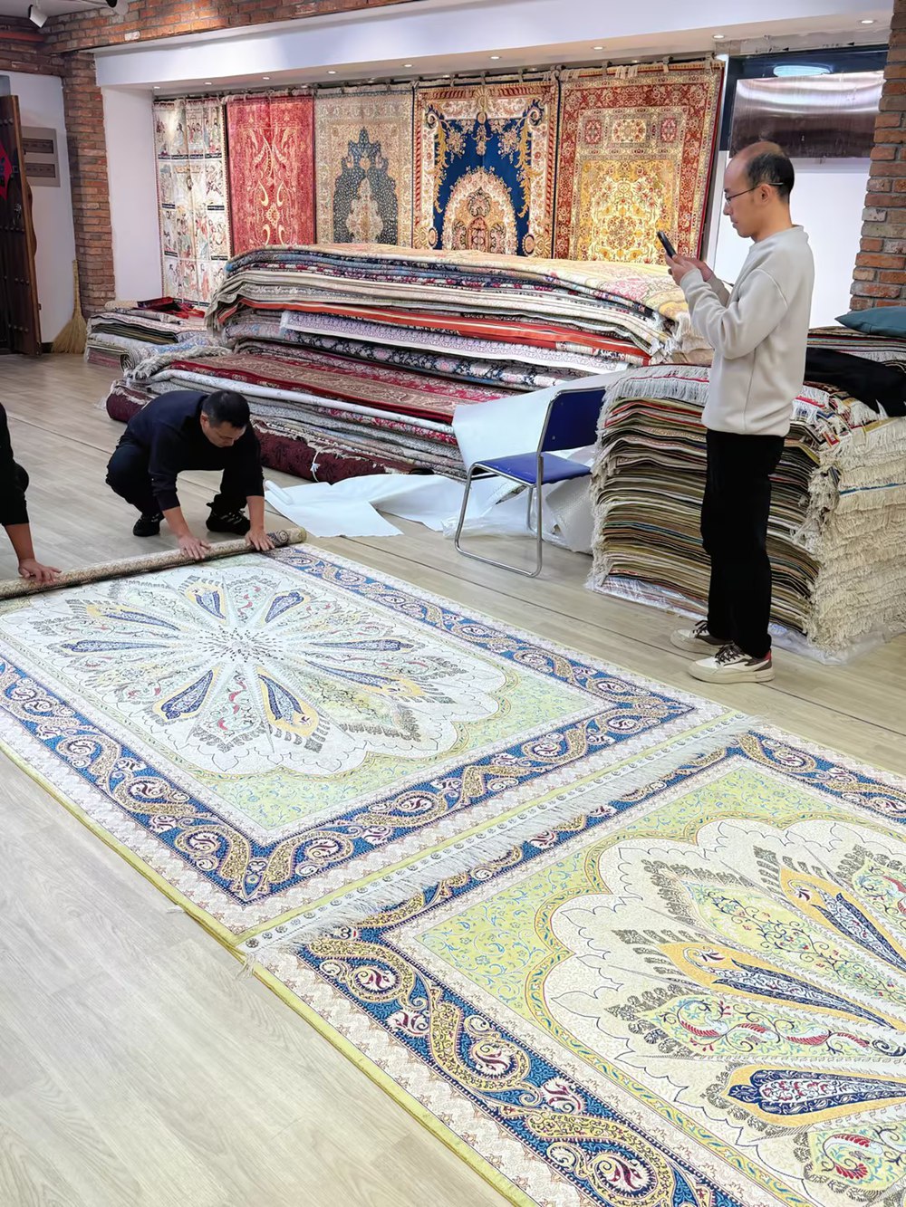 For this green peacock design handmade silk carpets with size 6x9ft and 8x10ft were shipped to our customer.