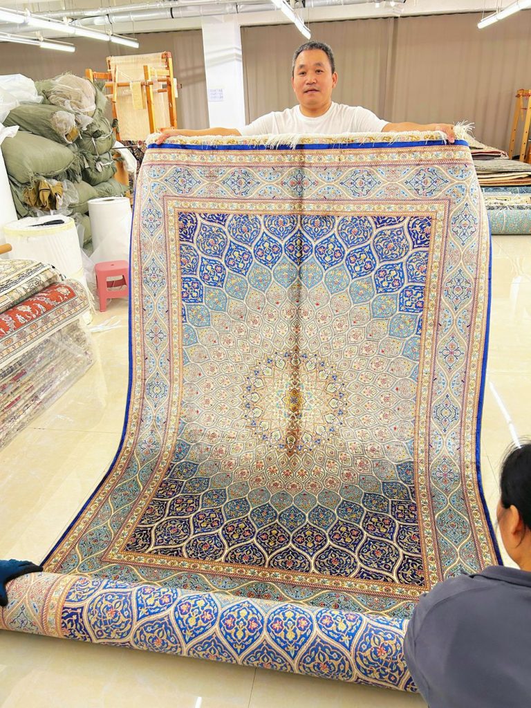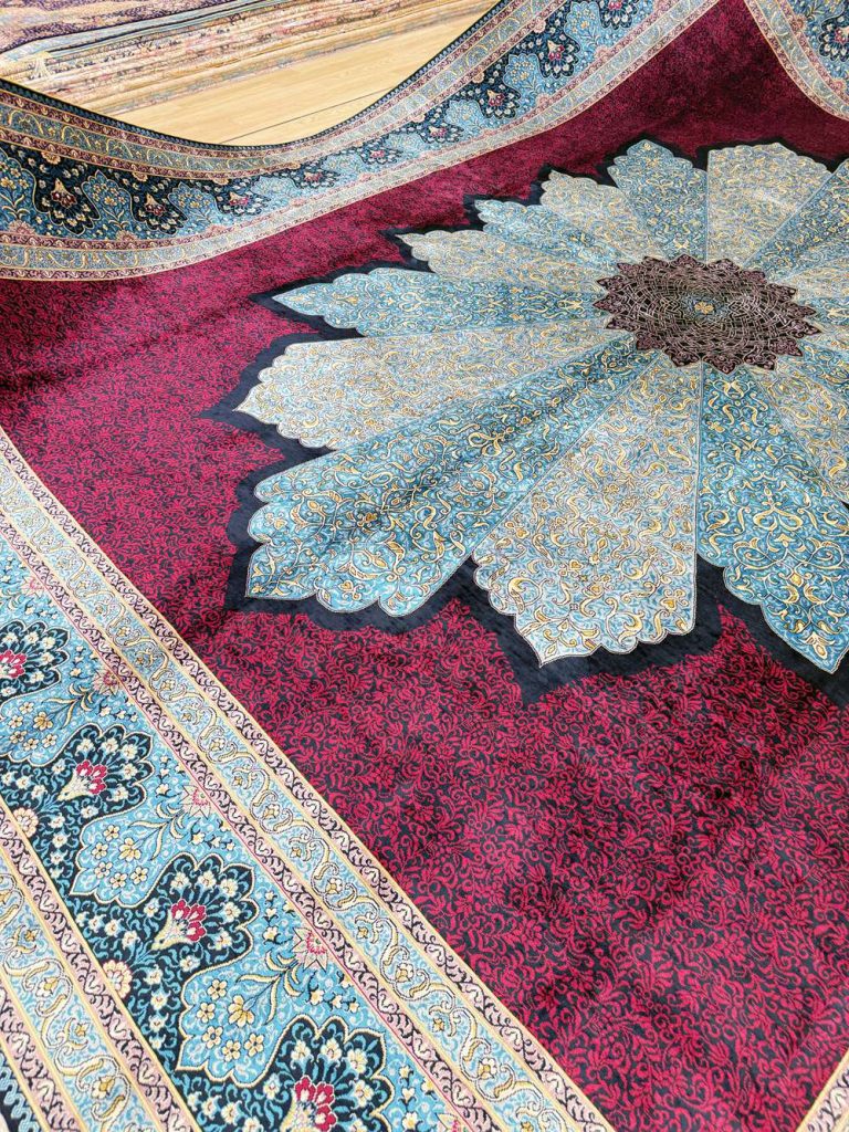 For this red Sultan design handmade silk carpet, size 6x9ft and 9x12ft are in stock now.