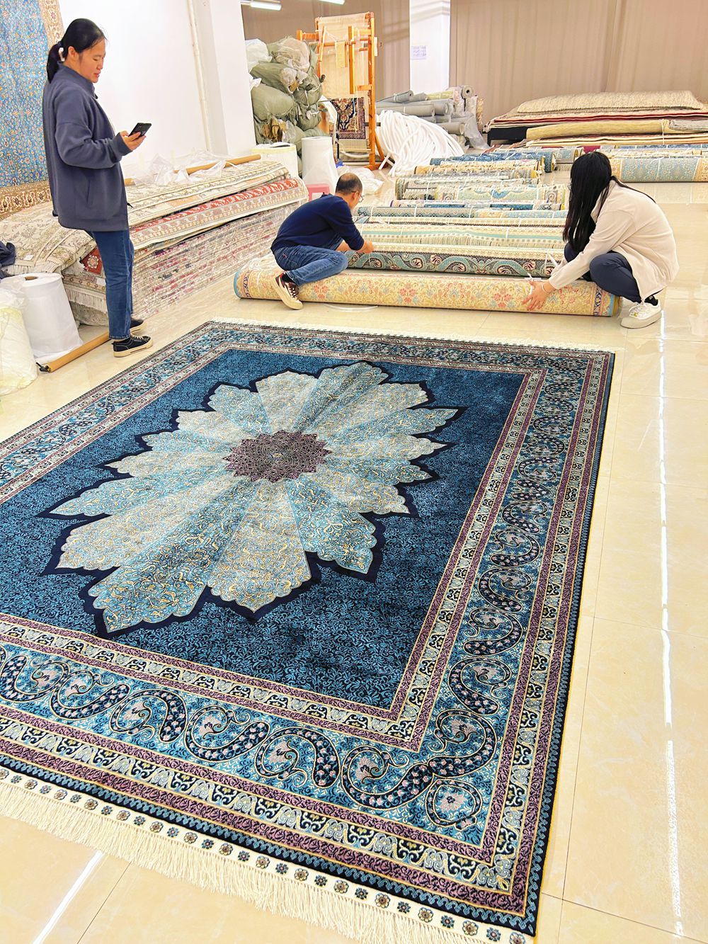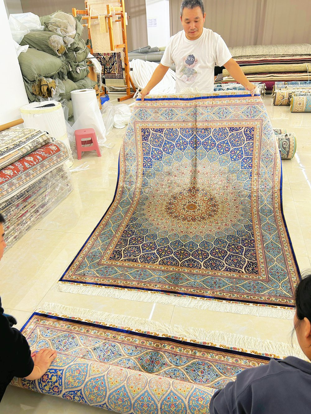 This is a busy day, everyone packed up the handmade silk carpets for our customer.